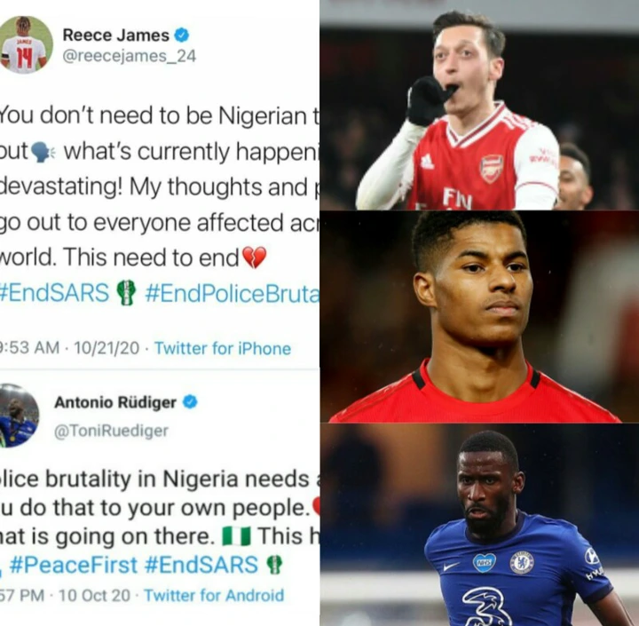 Some few foreign footballers have voiced out concerning the on going peaceful protest in Nigeria despite them not being citizens of Nigeria. The like of Marcus Rashford, Toni Rudiger, Mesut Ozil and other footballers accross Europe voiced out and they had various supportive and encouraging to say about it The crises Nigeria is going through this period of time is no news any more as it has circulated around the world.