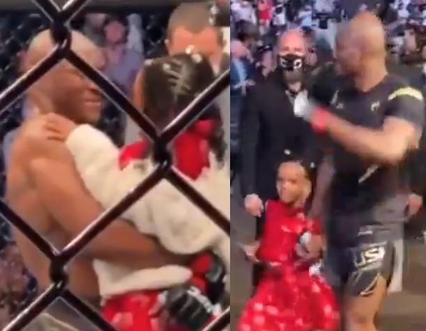 After the fight which saw 'The Nigerian nightmare' retained his UFC welterweight title to go on a 14-fight win streak, the proud father was seen celebrating with his daughter in the Arena before they left together.