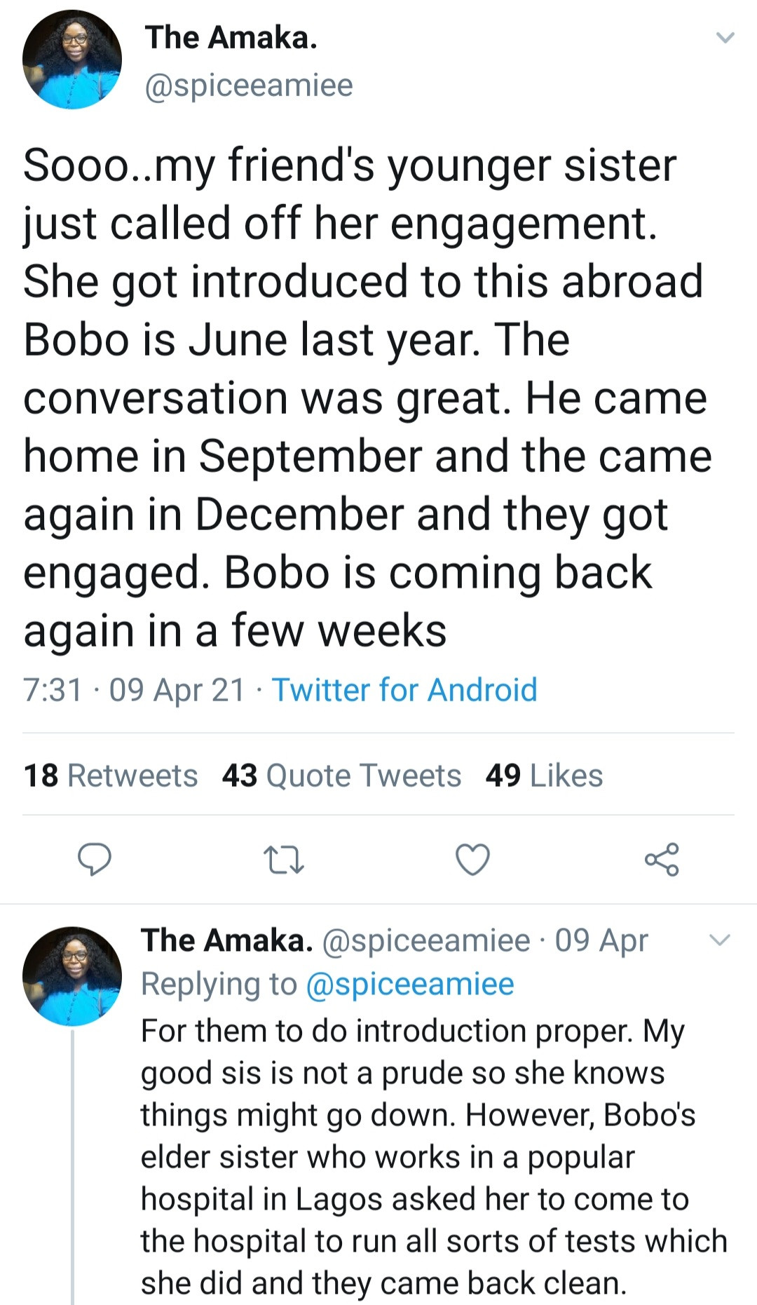 The story was shared to Twitter by someone claiming to know the bride. She explained that the fiancé, who lives abroad, was planning to return to Nigeria for them to have their introduction ceremony.