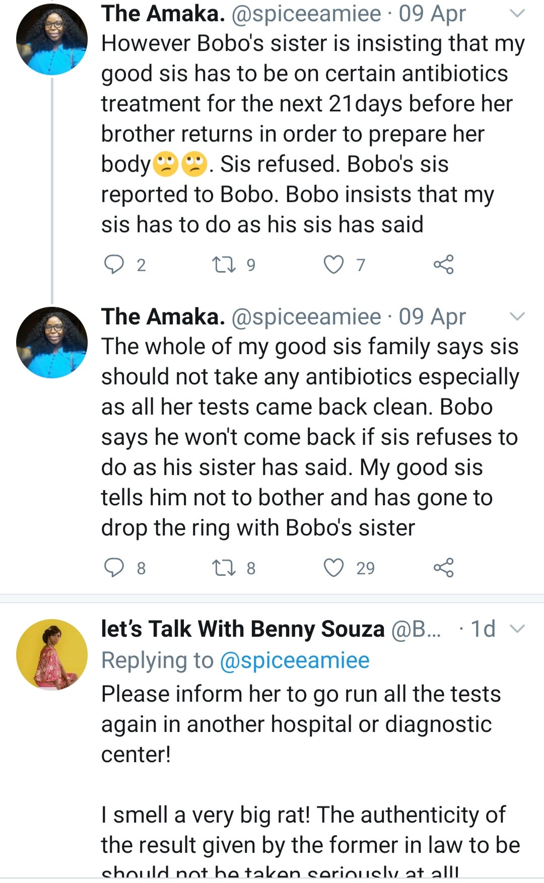 Yet, the family was still not satisfied and the bride-to-be was told by her in-laws that they will like to place her on antibiotics to prepare her body for their brother's return.