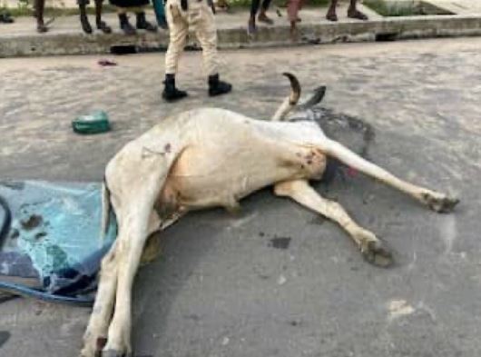''A commercial vehicle ran into two cows this morning at Agemowo, Badagry, killing one of the cows. The two cattle herders attacked someone they mistook for the vehicle conductor, resulting in his death. Angry residents blocked the highway in protest of the killing.