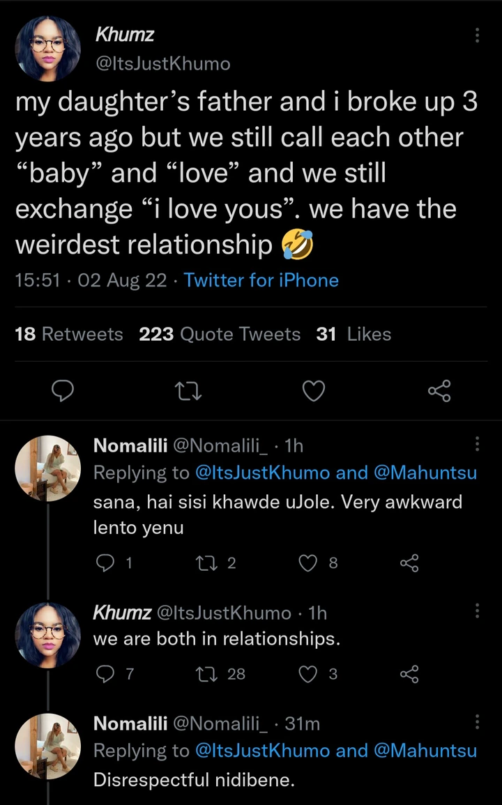 Khumo says she broke up with the father of her daughter 3 years ago but they still call each other with pet names. They even tell each other that they love each other even though they both have partners. People told her that they are disrespecting their partners while others vowed never to date people who have kids.